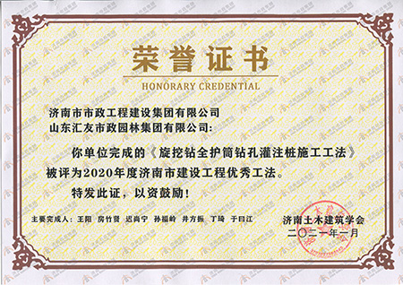• 2020年度济南市建设工程优秀工法《旋挖钻全护筒钻孔灌注桩施工工法》