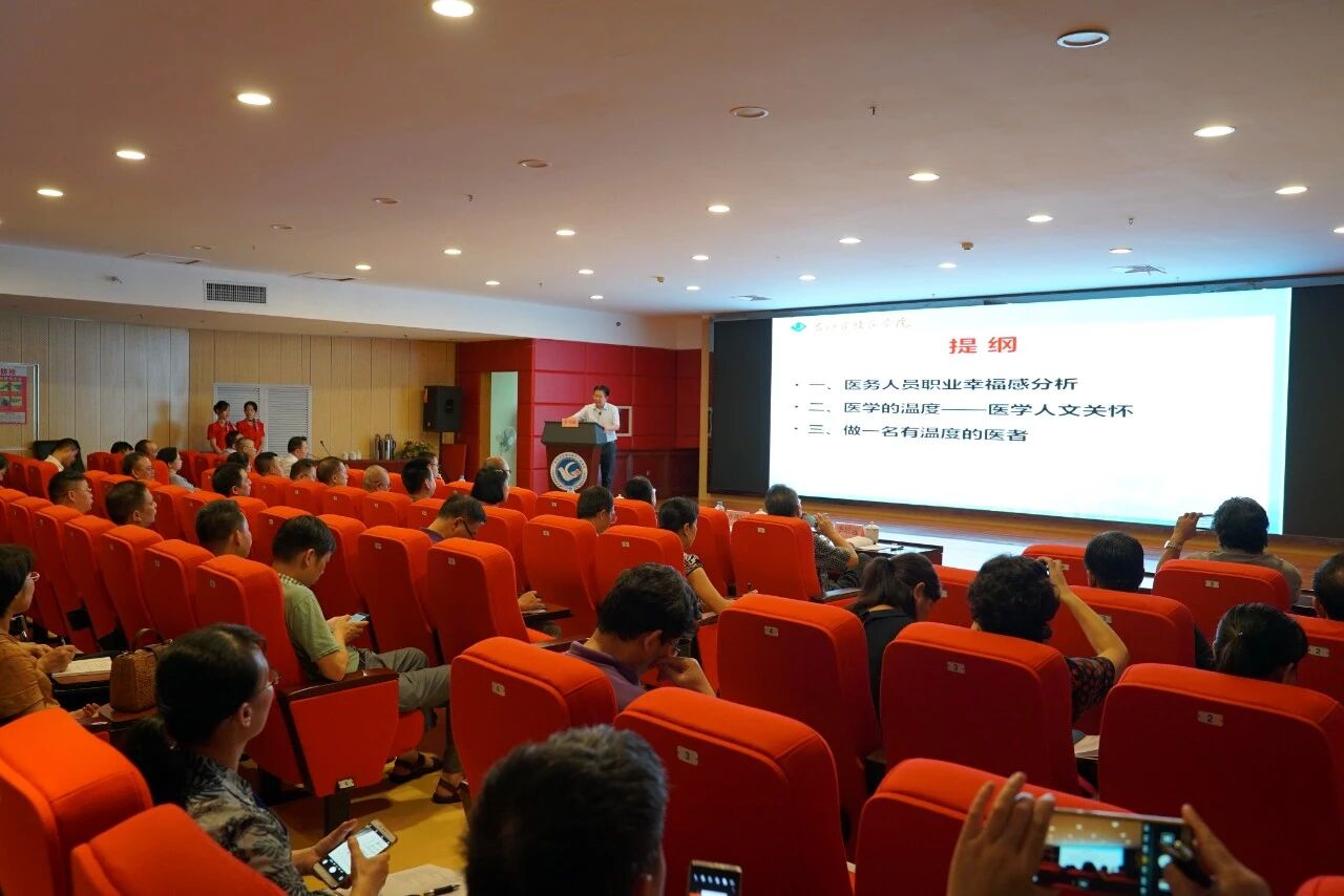 专题讲座首先由右江民族医学院党委常委、副校长、党委组织部部长李雪斌教授以《做一名有温度的医者》为题作报告。李教授从医学人文关怀角度讲述了医患关系紧张的今天应该如何做一名“有温度”的医务工作者。李教授诙谐幽默的语言、生动详实的案例,引起了在座同仁的强烈共鸣,以全新的视角和观念让大家重新认识了医患关系与医患沟通,令在场的医务工作者受益匪浅,让大家享受了一场医学人文的精神盛宴,接受了一次荡涤心灵的洗礼,开阔了视野,激发了职业自豪感和责任感。