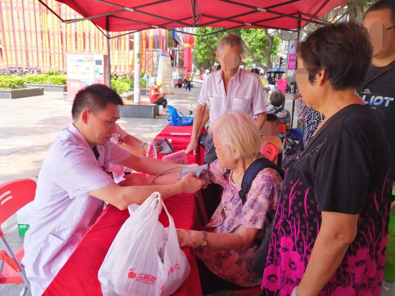 药剂科党支部何杰文、肝中儿科党支部邓凤平、门急诊党支部刘丽清到丽港广场参加“志愿为市民、党员先锋行”为民服务活动,为辖区居民提供义诊、健康咨询等服务。