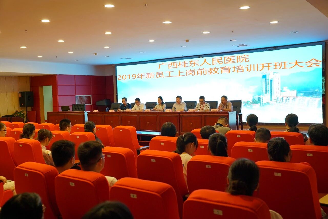 在门诊外科综合楼23楼大会议室举行2019年度新入职员工岗前培训开班大会,大会由党委书记、副院长蒋柳结主持,党委副书记、院长孔勇,党委副书记、纪委书记黎祖叠,党委委员、副院长程昌盛,党委委员、副院长成文东,工会主席李培远、院长助理陈坤以及各职能科室主要负责人参加开班大会。