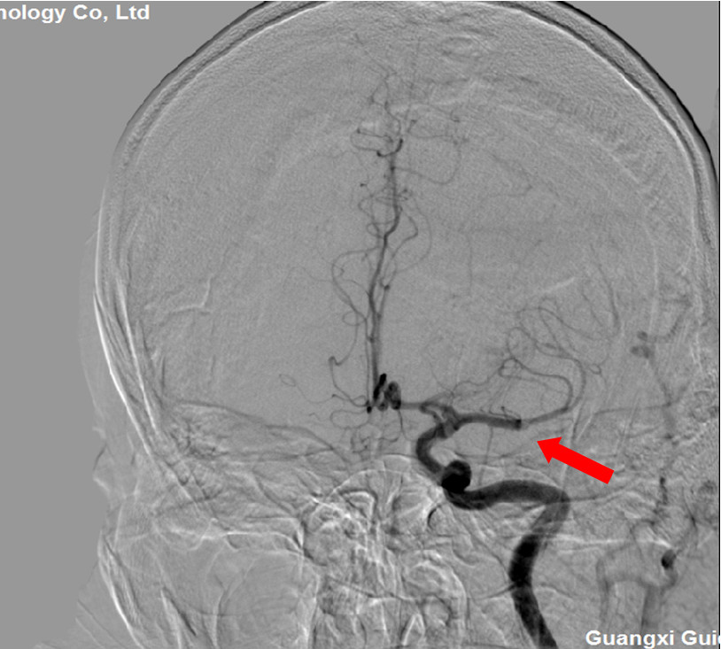 患者进入介入导管室,术前评估:患者有扩张型心脏病,查体:嗜睡,完全性失语,右侧肢体肌力0级,NIHSS评分14分,患者存在明确的严重神经功能缺损,头颅CT结果未见明确责任病灶,考虑脑栓塞超急性期,患者系急性大血管闭塞,目前处时间窗内,静脉溶栓和动脉机械取栓均为针对患者病情积极治疗手段,该类患者静脉溶栓再通率相对偏低,机械取栓有可能获得相对理想预后。