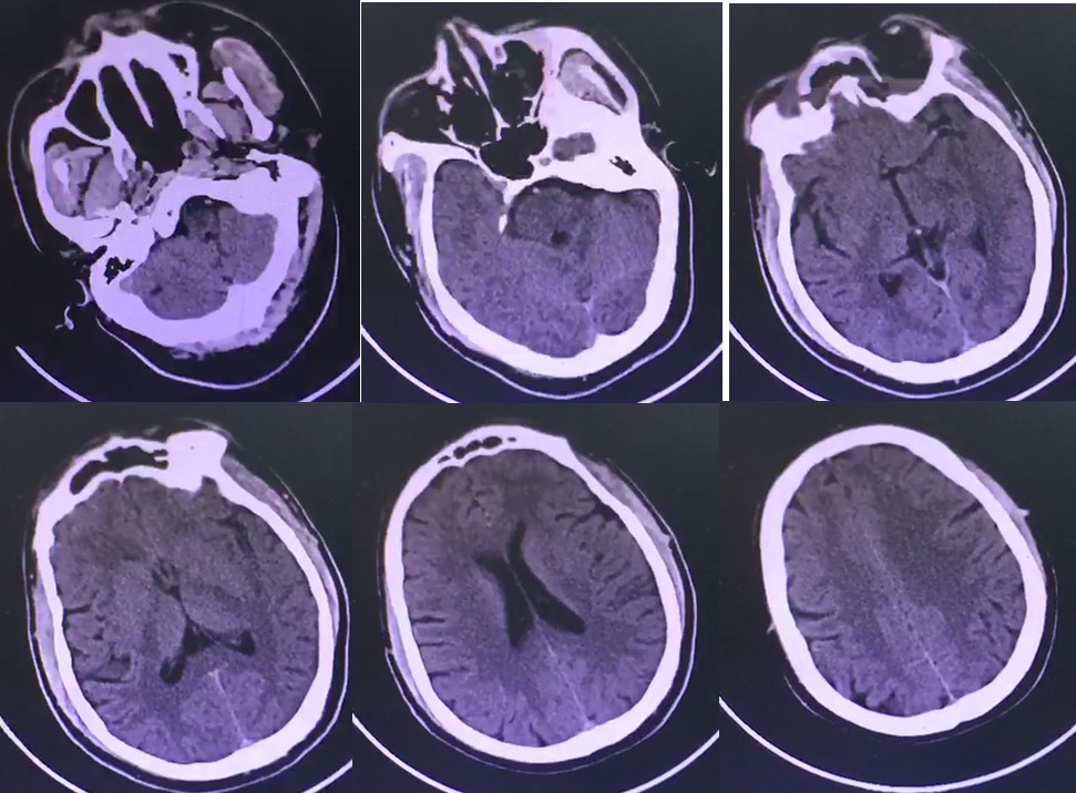 2019年07月19日 09:46 手术第二天,查体:神志清晰,混合性失语,右下肢肌力3级,右上肢肌力2级,,无恶心、呕吐,无抽搐、意识障碍等。复查头颅CT扫描如下图。