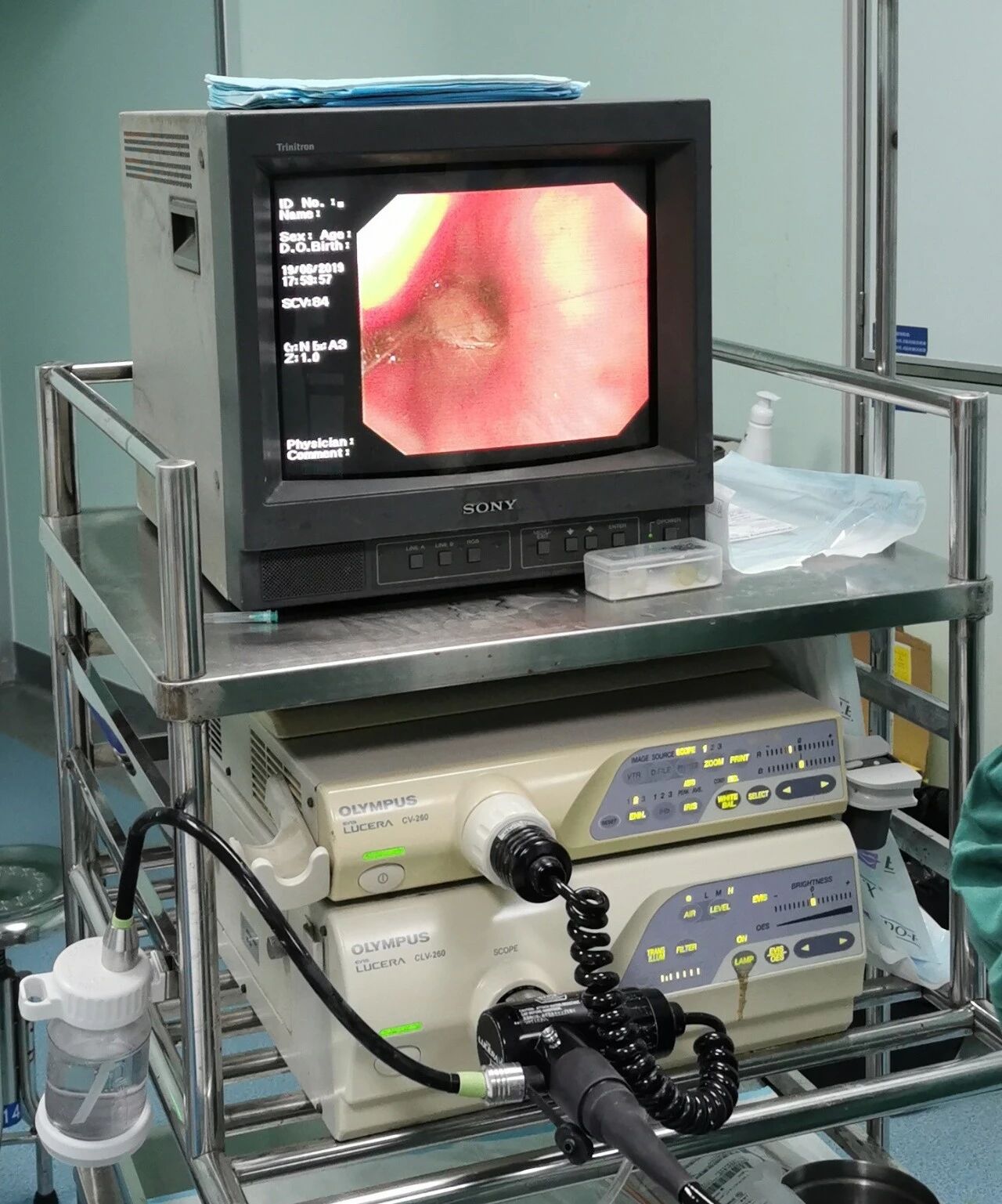 医务人员马上安排女孩到专科就诊,经简要询问病史及急行胸部CT检查。CT影像结果提示:1.食管上段(颈7、胸1水平)致密影,考虑食管异物并相应食管上段食管炎可能。2.考虑两肺炎症。诊断:1.食管内异物 2.肺部感染。因女孩情况紧急,立即安排入住91论坛 消化内科。