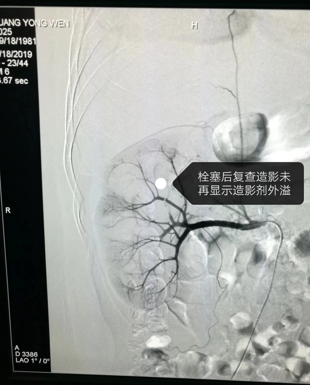 十五分钟后,当患者被送达介入室时,接到通知严阵以待的介入科值班医护人员立即为患者实施介入手术以抢救患者生命。消毒、穿刺、插管、造影,终于,在右肾上极看到一根动脉小分支外溢的造影剂揭示了患者肾脏出血的缘由。明确出血部位及出血责任动脉分支后,将微导管超选至出血部位的责任动脉分支,确认无误后选择用明胶海绵颗粒与弹簧圈封堵出血责任血管,整个治疗过程一气呵成。再次造影,之前持续出血的肾动脉分支未见再继续外溢,急慢性出血,介入显奇效,止血能立竿见影!真正体现介入治疗的微创、高效的治疗价值!
