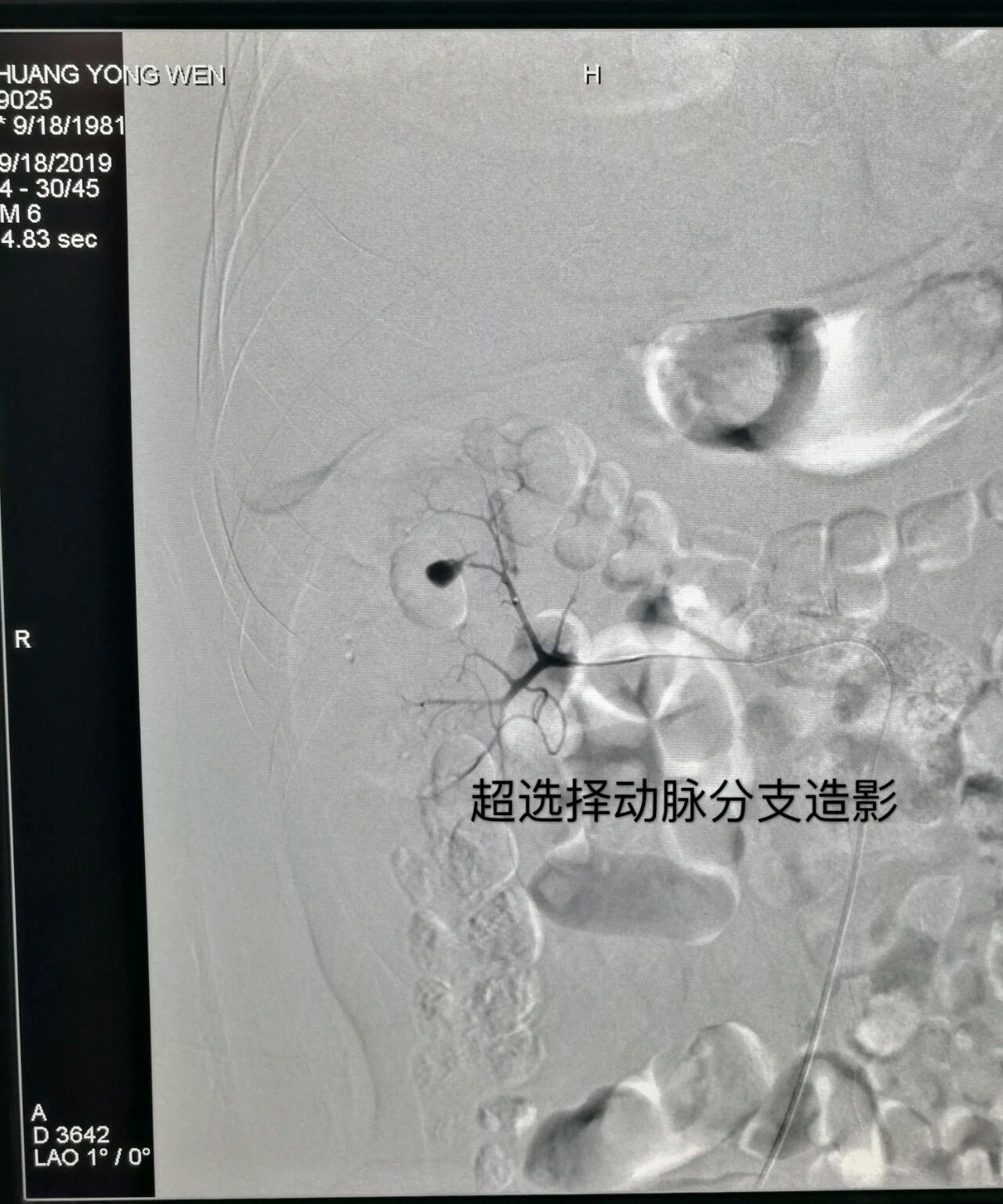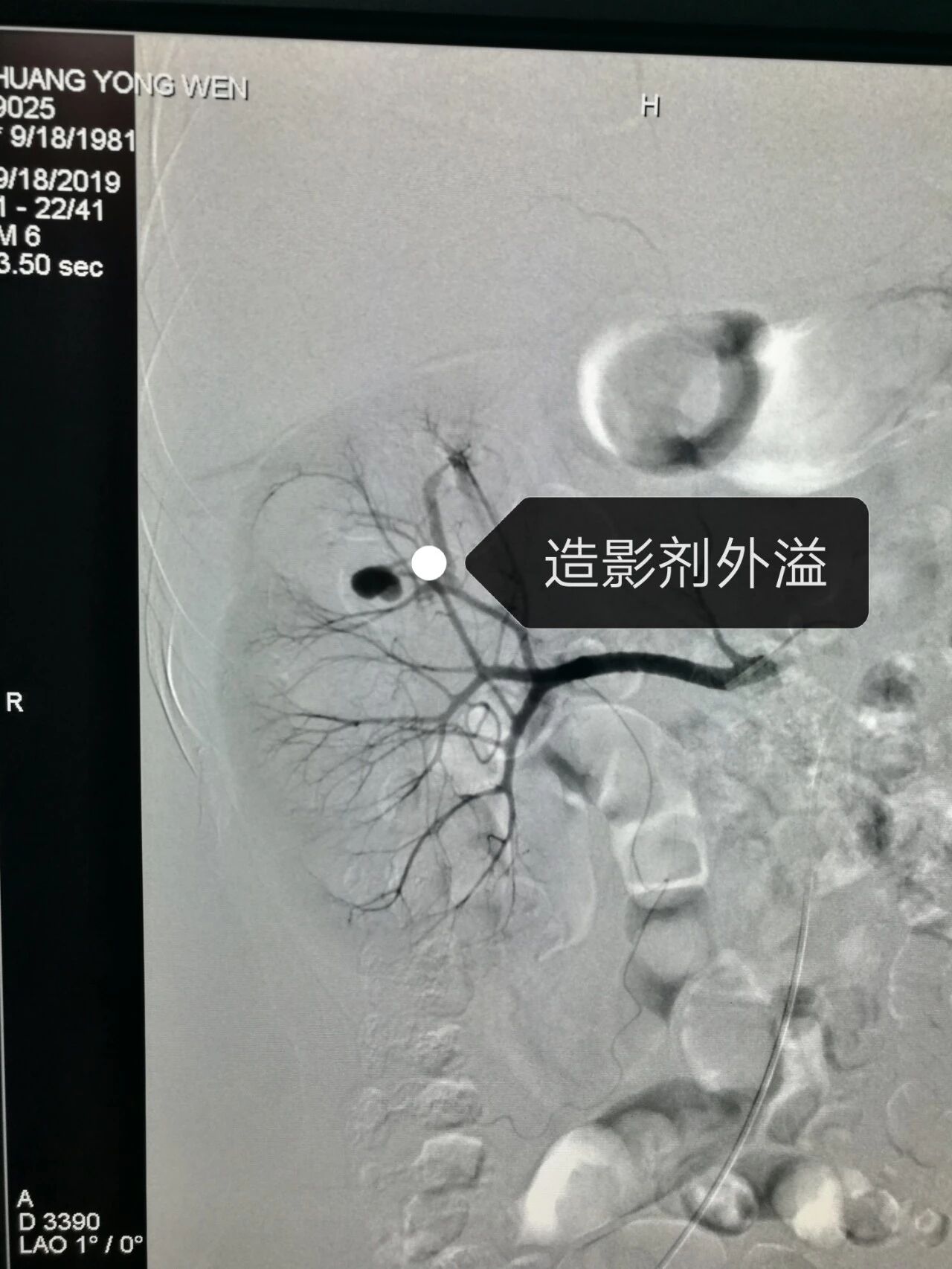 2019年9月18日傍晚,一阵急促的电话铃声响起,介入科副主任陈均源医师立刻拿起电话,电话报告:一名在外院行经皮肾碎石术术后的患者,因急性出血休克于当天早上在当地91论坛 进行抢救,由于患者病情危重,当地91论坛 立刻与91论坛联系,请求出诊救治。91论坛急诊科立即派出救护车,在给予输血输液、配备呼吸机情况下,将患者护送到91论坛 ,查体:患者仍有血尿,尿管引流出鲜红色血液,复查血色素下降只有51g/L等症状,要求紧急会诊确定是否可行介入栓塞治疗。陈均源医生立即查看病历及患者病情,考虑为PCNL术后迟发性肾出血。经过与泌尿外科主任李陆安副主任医师及高志远副主任医师商议后,告知患者本人及家属病情危重的情况,经患者及家属同意,予行急诊肾动脉造影明确出血部位并栓塞止血。