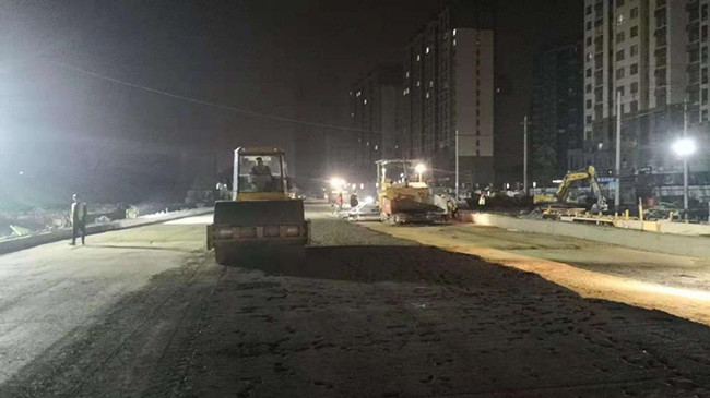 在龙脊河西侧,综合管廊回填及路床施工是节点能否按期完成的决定性因素,而北侧DN1500的雨水管是管廊回填的一个重要制约点。雨水沟挖深距现状地面7米,管径大, 挖槽、下管、回填都很困难,而且和综合管廊回填冲突,“管廊回填必须按期完成,雨水管这块硬骨头必须提前拿下!”在飞跃大道项目部职工日夜奋斗下,从10月7日至11日仅5天时间便完成雨水管施工任务,综合管廊回填也克服了中秋和国庆两个假期的断点,在规定工期内完成任务。