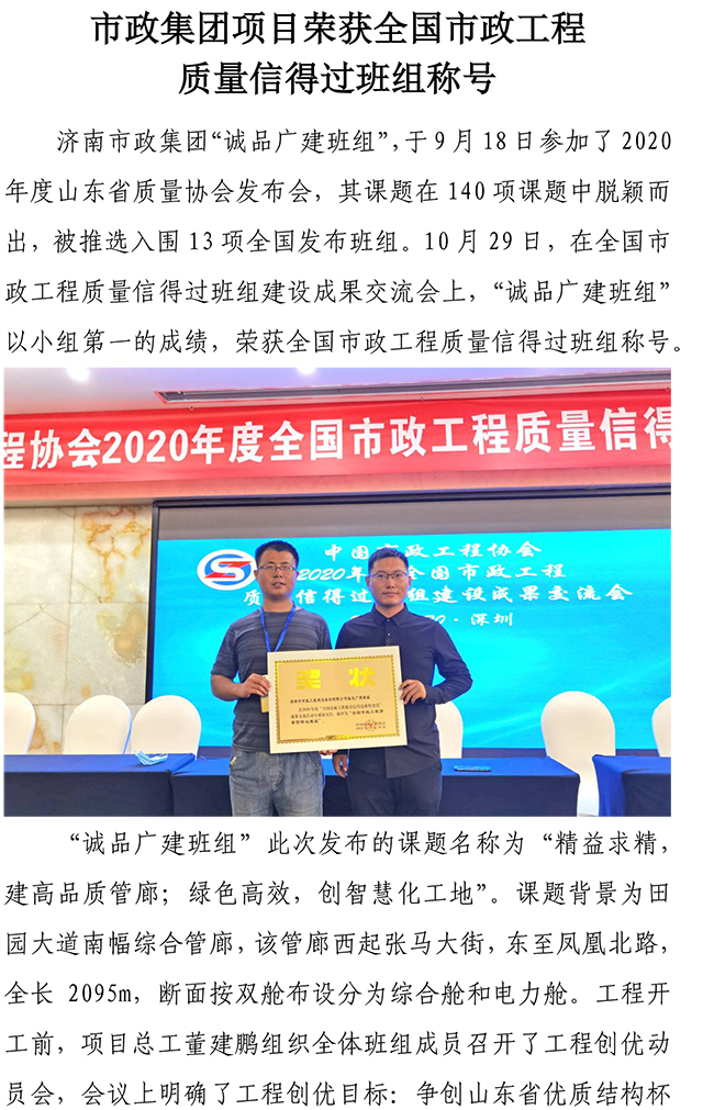 济南91论坛 项目荣获全国市政工程质量信得过班组称号