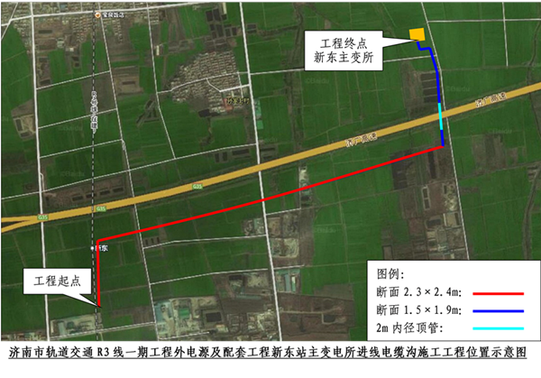 本工程位于济南新东站片区,工程起点为新东站片区规划北环路,北至穿越济青高速最终至R3线济南东站。新建电缆线路3000m,其中2.3×2.4m电缆沟2400m ,1.5×1.9m电缆沟450m,2.0m内径顶管150m(钻越济广高速)。工期为180日历天。