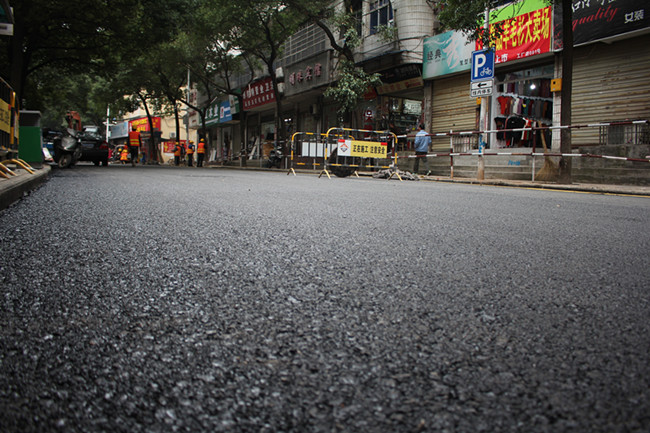 沿街树木影响施工。玉琳路沿街栽种的是香樟木,由于树龄较长,树冠庞大,影响大型机械的施工。前期开挖沟槽和后期摊铺沥青时,园林部门特别指出要做好景观树的保护,采取必要措施,不得损坏。运送沥青摊铺料的自卸车,车斗升起高度在7—8米以上,沿线妨碍摊铺的树木,基本都是采用人工支撑等方法避开料斗,虽然费时费力,但保证了树木的完好。